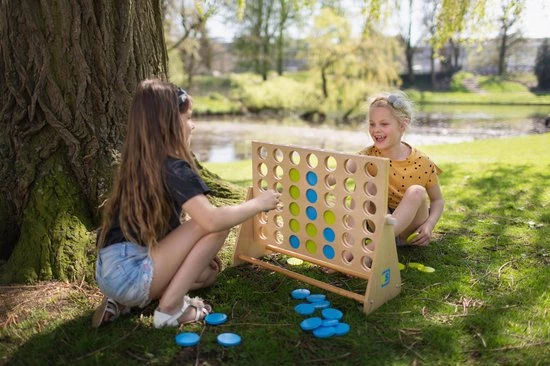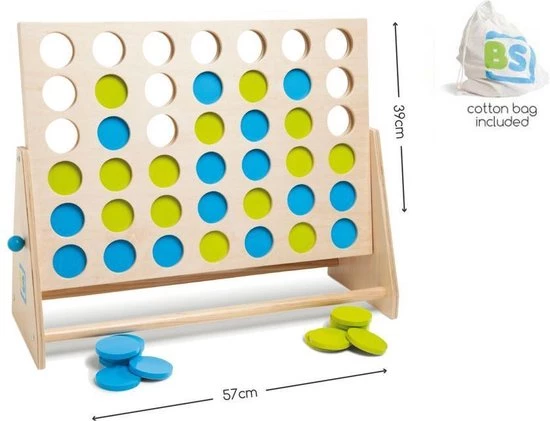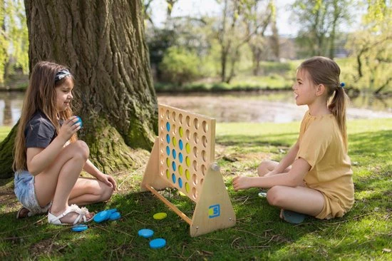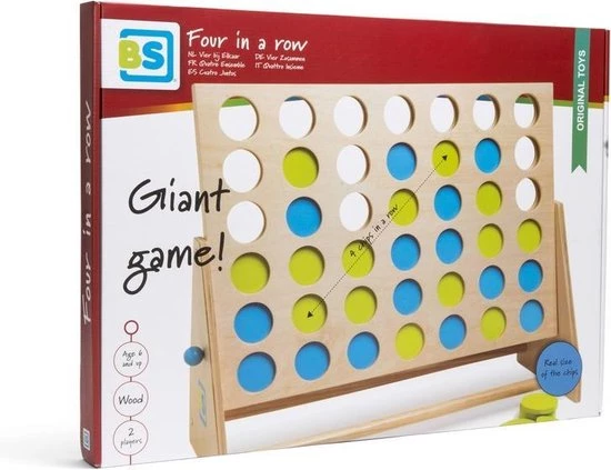 Extra groot van formaat! Gooi om de beurt een fiche in het frame en zorg dat er vier van dezelfde kleur in ??n lijn liggen. Dit kan zowel horizontaal als verticaal. Een geweldig spel dat je steeds weer opnieuw wilt spelen! Vier op een rij is een strategisch spel dat nooit gaat vervelen. Zowel voor jong en oud kun je dit spel binnen als buiten spelen. Het ideale speelgoed voor op reis!