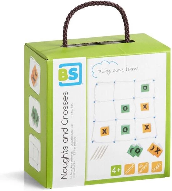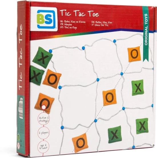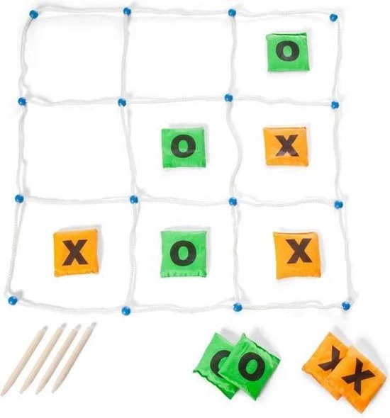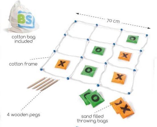Een actieve variant van ?Boter Kaas en Eieren! Leg het touwen ?speelbord? netjes uit op de grond en probeer als eerste 3 dezelfde speelzakjes op een rij te leggen. Maak het extra moeilijk door de speelzakjes van een afstand in het juiste vakje te gooien. Of maak er leuke estafette van!