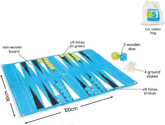 BS Backgammon is extra grote en mooie uitgave van het spel. Zorg ervoor dat jouw stenen als eerste aan de andere kant zijn. Bij backgammon komt zowel geluk als tactiek om de hoek kijken. Doek 80x100cm, houten stenen, 2x dobbelstenen en 4 haringen.