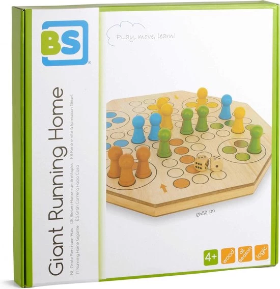 Extra grote ren naar huis van BS®, dit spel is lekker groot zodat je gemakkelijk buiten in de tuin kunt spelen of heerlijk met z’n allen binnen op de grond. Wie weet het snelst zijn pionnen naar huis te brengen? Bord 50x50cm
