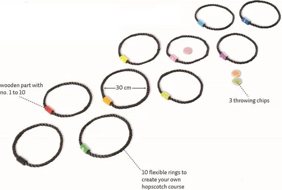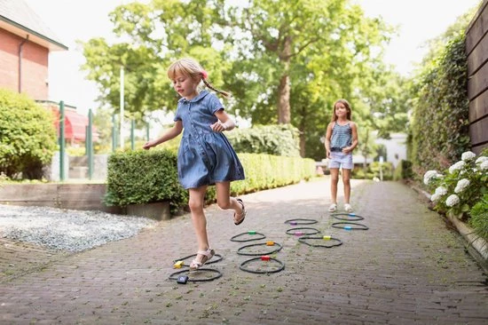 Met deze hinkelbaan maak je helemaal zelf jouw favoriete parcours! Leg de ringen juist dicht bij elkaar of ver van elkaar af om het makkelijker of moeilijker te maken. Natuurlijk kun je dit spel met meerdere kinderen spelen, maar in je eentje kan ook.