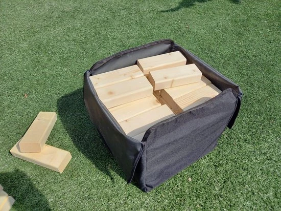 JENGA XXL wordt geleverd in een canvas tas. Deze stevige tas met rits is perfect om de stenen overal mee te kunnen nemen en veilig te bewaren. De stenen van de JENGA XXL vormen een toren van 0,9 meter hoog aan het begin van het spel.