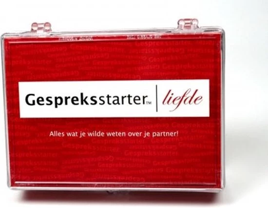 Hoe goed ken je de partner waar je al dertig jaar mee samen leeft, je nieuwe grote liefde of de persoon waar je mee gaat trouwen? Ontdekt het met Gespreksstarter Liefde! Deze box bevat 110 kaartjes met grappige, een tikkeltje uitdagende, interessante en onverwachte vragen die je veel zullen leren over je partner en jezelf, op een leuke en grappige manier. Kom te weten hoe je geliefde zou antwoorden op vragen zoals “Wat doe je om mij te plezieren dat je zelf helemaal niet leuk vindt om te doen?” of “Wat is de grappigste anekdote uit je verleden dat je mij kan vertellen?” Afmeting 140 x 140 x 40 mm. Gewicht 0.5 kg.