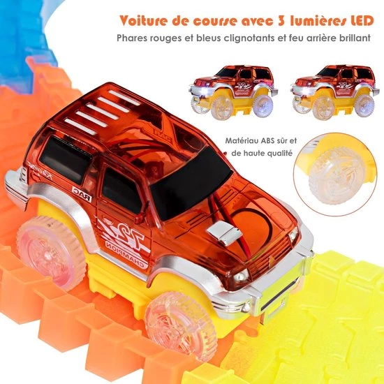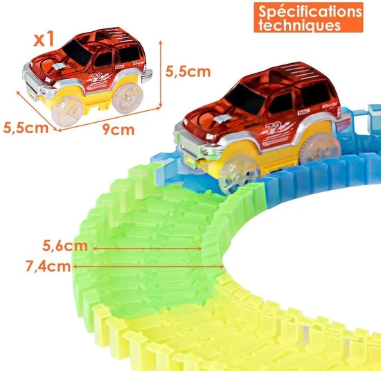 【Luminous Toy】De raceauto is voorzien van een nachtlampje achterin en twee rode en blauwe zwaailichten voorin, de hele baan lijkt zelfs in het donker te fonkelen. De 4 verschillende kleuren van de baanstukken vormen een prachtig visueel feest, waardoor uw kinderen zich ‘s avonds kunnen vermaken.