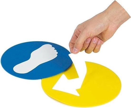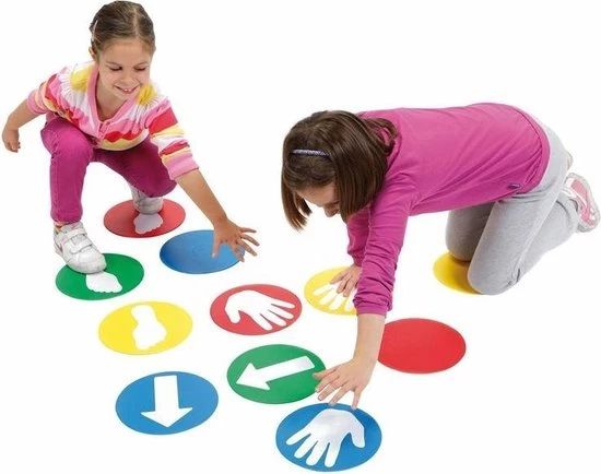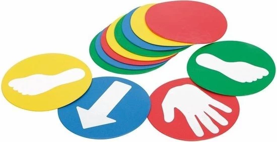 12 vrolijke gekleurde antislip schijven. Bijgeleverd worden stickers in de vorm van handjes, voetjes en pijltjes welke op de schijven geplakt kunnen worden (6 voetjes, 6 handjes en 3 pijlen). Ideaal om een oefenparcours uit te zetten.