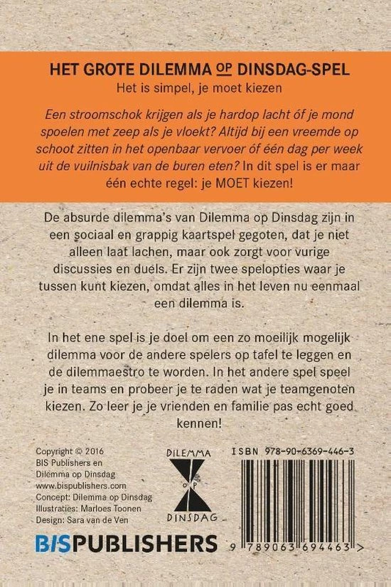 De makers van Het Grote Dilemma op Dinsdag-boek zijn terug! In dit geweldige spel met mooie illustraties en lachwekkende dilemma’s is er maar één echte regel: je MOET kiezen…