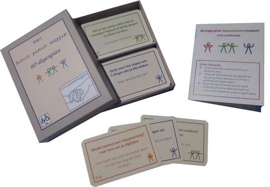 Het 60-dagenplan bestaat uit een doosje met 60 tipkaartjes en een instructie voor de ouder, verzorger of begeleider. Je bespreekt elke dag een tip met je kind. Doordat je kind de tips gebruikt, wordt het stapje voor stapje mentaal sterker. Hoe sterker je kind mentaal is, hoe minder het gepest wordt.