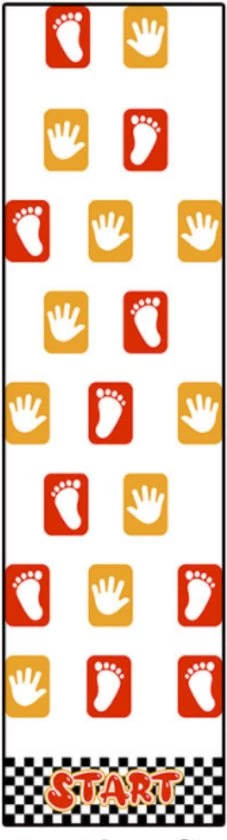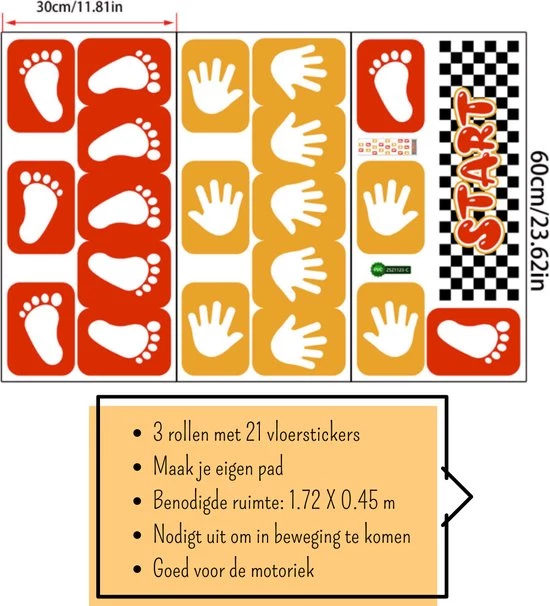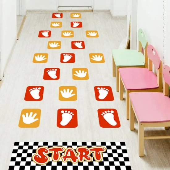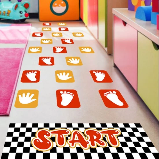 Hoe krijg je kinderen in beweging? Met dit beweegspel! Het beweegpad bestaat uit afzonderlijke vloerstickers met handen en voeten en een startvak. Je kunt zelf de volgorde en de moeilijkheidsgraad bepalen. In een handomdraai heb je ze op de vloer en/of op de muur geplakt en kunnen de kinderen beginnen. Dit beweegspel is niet alleen zeer geschikt voor in de kinderopvang of op school, maar ook voor openbare ruimtes en gewoon thuis.