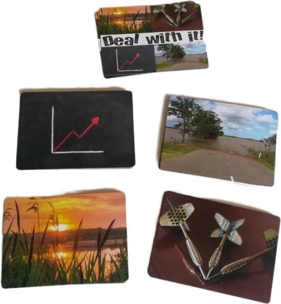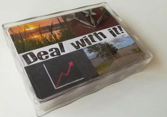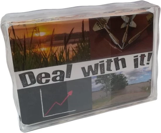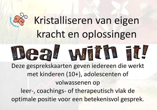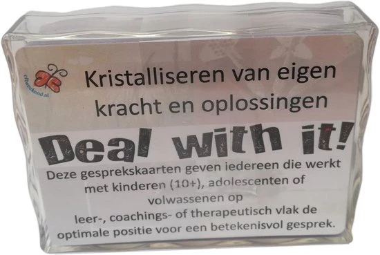 ‘Deal with it!’ gesprekskaarten zijn gemakkelijk én effectief: je kiest, ontdekt én bepaalt zelf de koers van het gesprek. Het spel bestaan uit 40 vragen verdeeld in 4 categorieën; Intentie, Winst, Nadeel en Hoopgevend. De kaarten -met vraag en een inspirerende foto- zitten in een doorzichtig hard plastic doosje. Een speler pakt uit elke stapel vragen die juist voor hem relevant zijn. Op deze manier ga je altijd een zinvol gesprek aan. Na het spelen van ‘Deal with it!’ heb je meer overzicht van het totaalbeeld van je situatie. Is het duidelijker wat je handelswijze zou moeten zijn. Is duidelijk welk doel je moet kiezen. Heb je meer motivatie om te ondernemen. Ben je in contact met je eigen kracht en mogelijkheden. heb je praktische handvatten. Ook voor professionals zijn de kaarten een uitkomst. Deze gesprekskaarten geven iedereen die werkt met kinderen (10+), adolescenten of volwassenen op leer-, coachings- of therapeutisch vlak de optimale startpositie voor een betekenisvol gesprek.