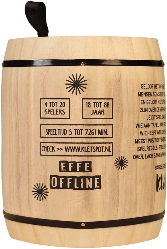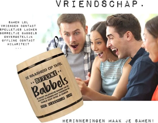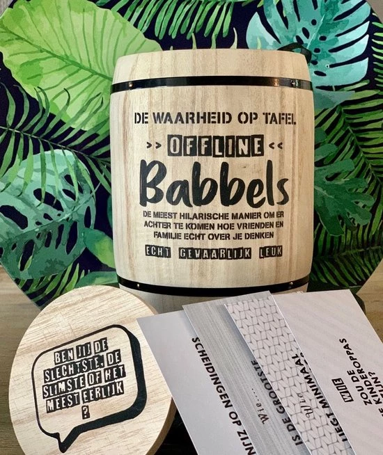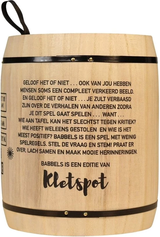 Omschrijving Kletspot Offline Babbels De waarheid op tafel met de Kletspot Offline Babbels! Een geschikte bezigheid om samen met de familie, vrienden of collega’s te doen. Pas op dat je tijdens het spelen niet valt van je stoel, ten gevolge van de hilarische antwoorden van jouw medespelers. De Kletspot Offline Babbels heeft 200 vragen en heeft weinig spelregels en zorgt voor hilarische momenten. Verwen daarom jezelf of een speciaal iemand met dit spel. Eigenschappen * Kleuren: Verschillende tinten bruin