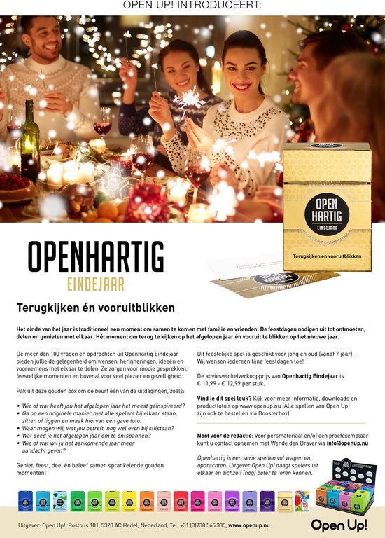 De meer dan 100 vragen en opdrachten uit Openhartig Eindejaar bieden jullie de gelegenheid om wensen, herinneringen, idee????n en voornemens met elkaar te delen. Ze zorgen voor mooie gesprekken, feestelijke momenten en bovenal voor veel plezier en gezelligheid.