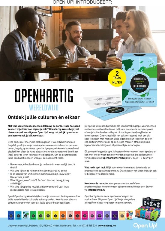 Met veel verschillende mensen delen wij de aarde. Maar hoe goed kennen wij elkaar nou eigenlijk echt? Openhartig Wereldwijd, het nieuwste spel van uitgever Open Up!, vergroot je kijk op culturen en daarmee ook je kijk op elkaar.