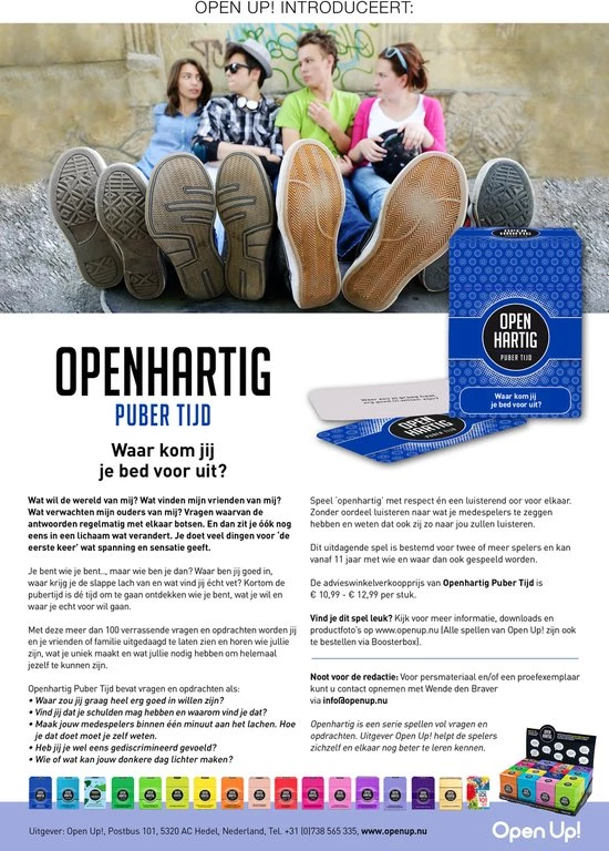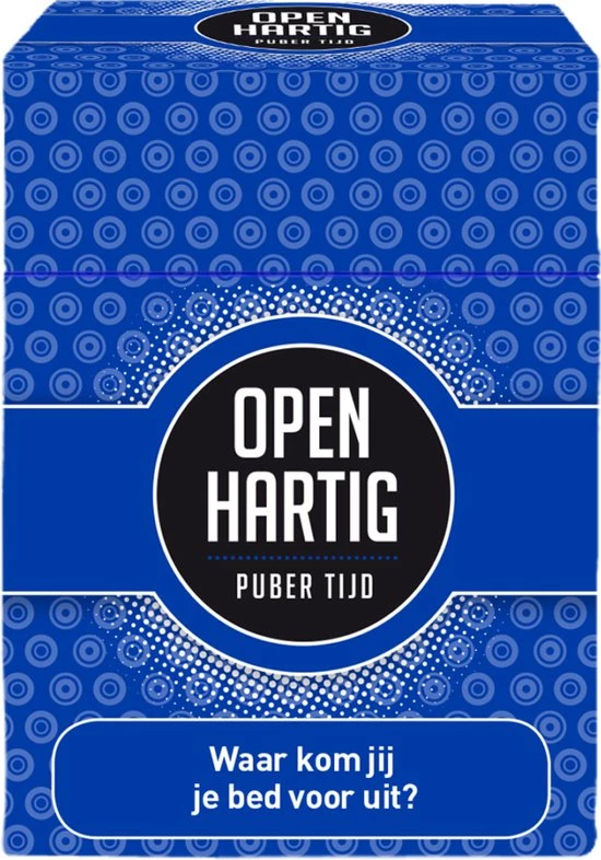 Wat wil de wereld van mij? Wat vinden mijn vrienden van mij? Wat verwachten mijn ouders van mij? Vragen waarvan de antwoorden regelmatig met elkaar botsen.En dan zit je ??k nog eens in een lichaam wat verandert.Je doet veel dingen voor ?de eerste keer? wat spanning en sensatie geeft.Je bent wie je bent.., maar wie ben je dan? Waar ben jij goed in, waar krijg je de slappe lach van en wat vind jij ?cht vet? Kortom de pubertijd is d? tijd om te gaan ontdekken wie je bent, wat je wil en waar je echt voor wil gaan.Met deze meer dan 100 verrassende vragen en opdrachten worden jij en je vrienden of familie uitgedaagd te laten zien en horen wie jullie zijn, wat je uniek maakt en wat jullie nodig hebben om helemaal jezelf te kunnen zijn.Openhartig Puber Tijd bevat vragen en opdrachten als:? Waar zou jij graag heel erg goed in willen zijn?? Vind jij dat je schulden mag hebben en waarom vind je dat?? Maak jouw medespelers binnen ??n minuut aan het lachen. Hoe je dat doet moet je zelf weten.? Heb jij je wel eens gediscrimineerd gevoeld?? Wie of wat kan jouw donkere dag lichter maken?Speel ?openhartig? met respect ?n een luisterend oor voor elkaar. Zonder oordeel luisteren naar wat je medespelers te zeggen hebben en weten dat ook zij zo naar jou zullen luisteren.Dit uitdagende spel is bestemd voor twee of meer spelers en kan vanaf 11 jaar met wie en waar dan ook gespeeld worden.