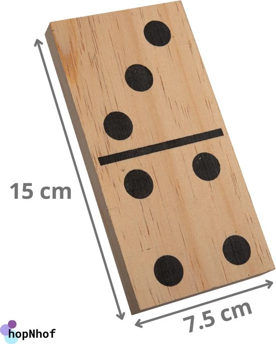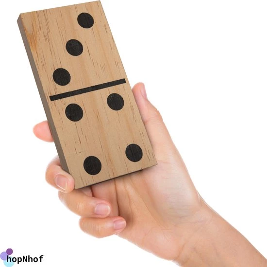 Dezer grote domino spel met stenen gemaakt van hout is geschikt voor binnen en buiten. Elke steen is ongeveer 15 x 7.5cm groot. Zeker een leuke spel voor je kinderen tijdens de herfstvakantie.