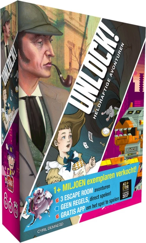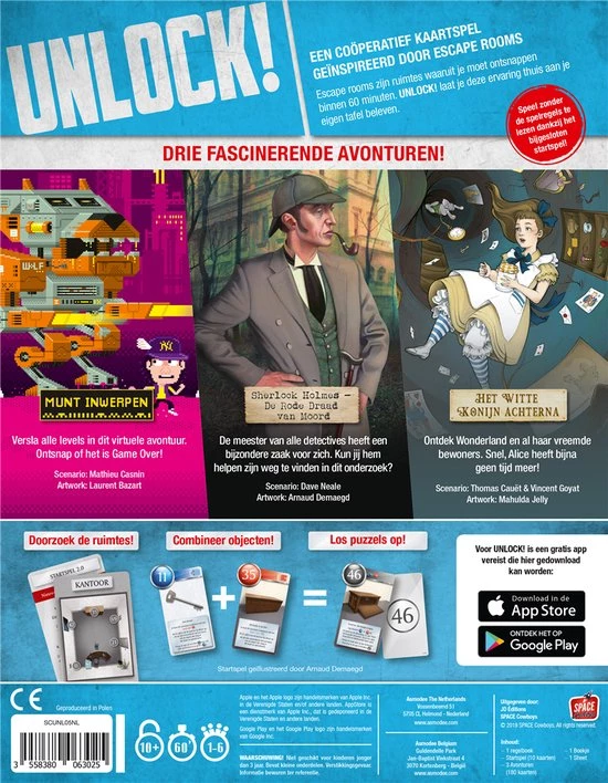 Unlock is een coƶperatief kaartspel geĆÆnspireerd door escape rooms; ruimtes waaruit je moet ontsnappen binnen 60 minuten. Unlock! laat je deze ervaring nu thuis aan je eigen tafel beleven met 3 scenario’s (60 kaarten per scenario) en een gratis app die je door de 3 scenario’s leidt. Doorzoek de ruimtes, combineer voorwerpen en los alle puzzels op voordat de tijd op is!