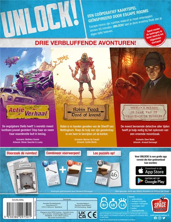 Unlock! is een co?peratief kaartspel ge?nspireerd op escape rooms, ruimtes waaruit je moet ontsnappen binnen 60 minuten. Unlock! laat je deze ervaring nu thuis aan je eigen tafel beleven met een kaartendeck en een gratis app die je door de diverse scenario’s leidt. Doorzoek de ruimtes, combineer voorwerpen en los alle puzzels op! Werk goed samen om het avontuur op te lossen.