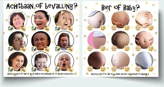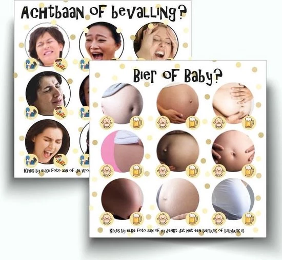 Bier of Baby is een grappig babyshowerspel dat het gegarandeerd goed doet op elk babyfeestje! Kijk wie van de aanwezigen het best kan inschatten of er een Bierbuik of een Babybuik op de foto’s te zien is.