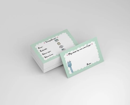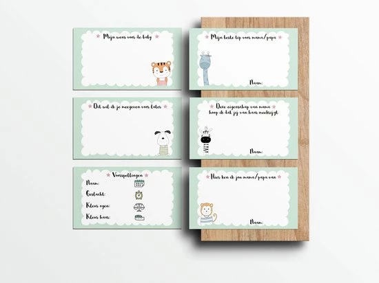 Maak met deze leuke kleine wens en voorspellingskaartjes je babyshower helemaal compleet. Laat iedereen ??n of meerdere kaartjes invullen en geef een leuk herrineringscadeau aan ouders en baby.