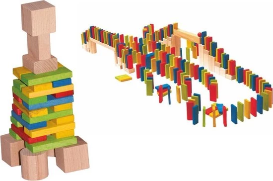 Met deze houten domino set bestaande uit 200 stenen, kun je een flinke baan bouwen met bruggen en knikkers.